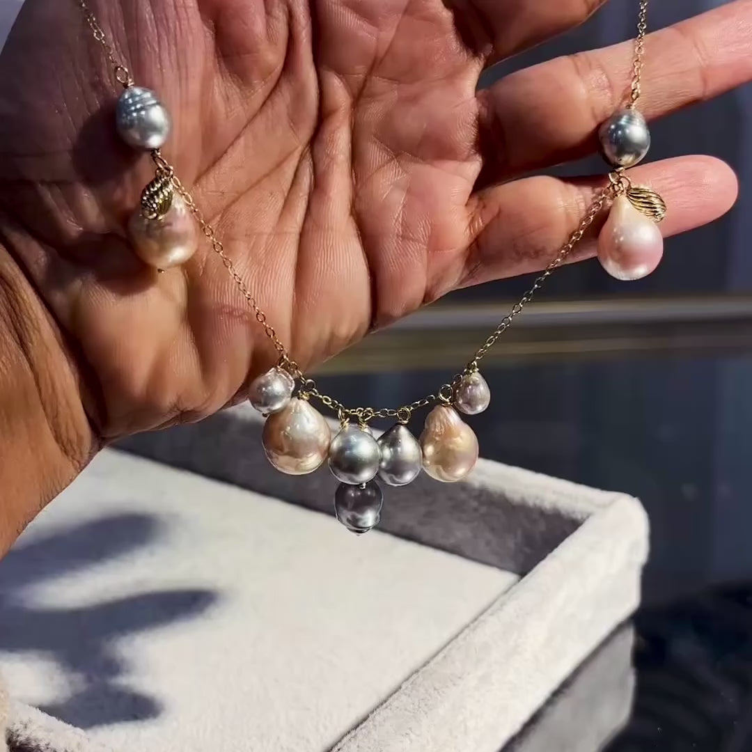 As a singular selection within the Flow collection, this necklace honors motion that doesn’t rush yet always arrives. It maps a transition through a rhythmic descent of nacre and 14k yellow gold; a cascading sequence of Tahitian, Akoya, and Freshwater pearls that serve as biological artifacts of shadow, luster, and dawn.