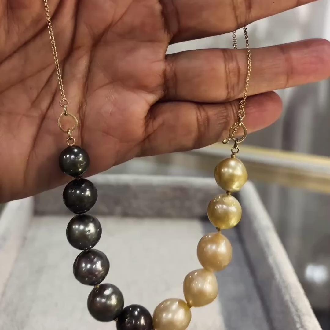 - Natural Baroque Golden South Sea pearls from the Philippines and Tahitian Pearls from French Polynesia, 9-12mm, ethically sourced.