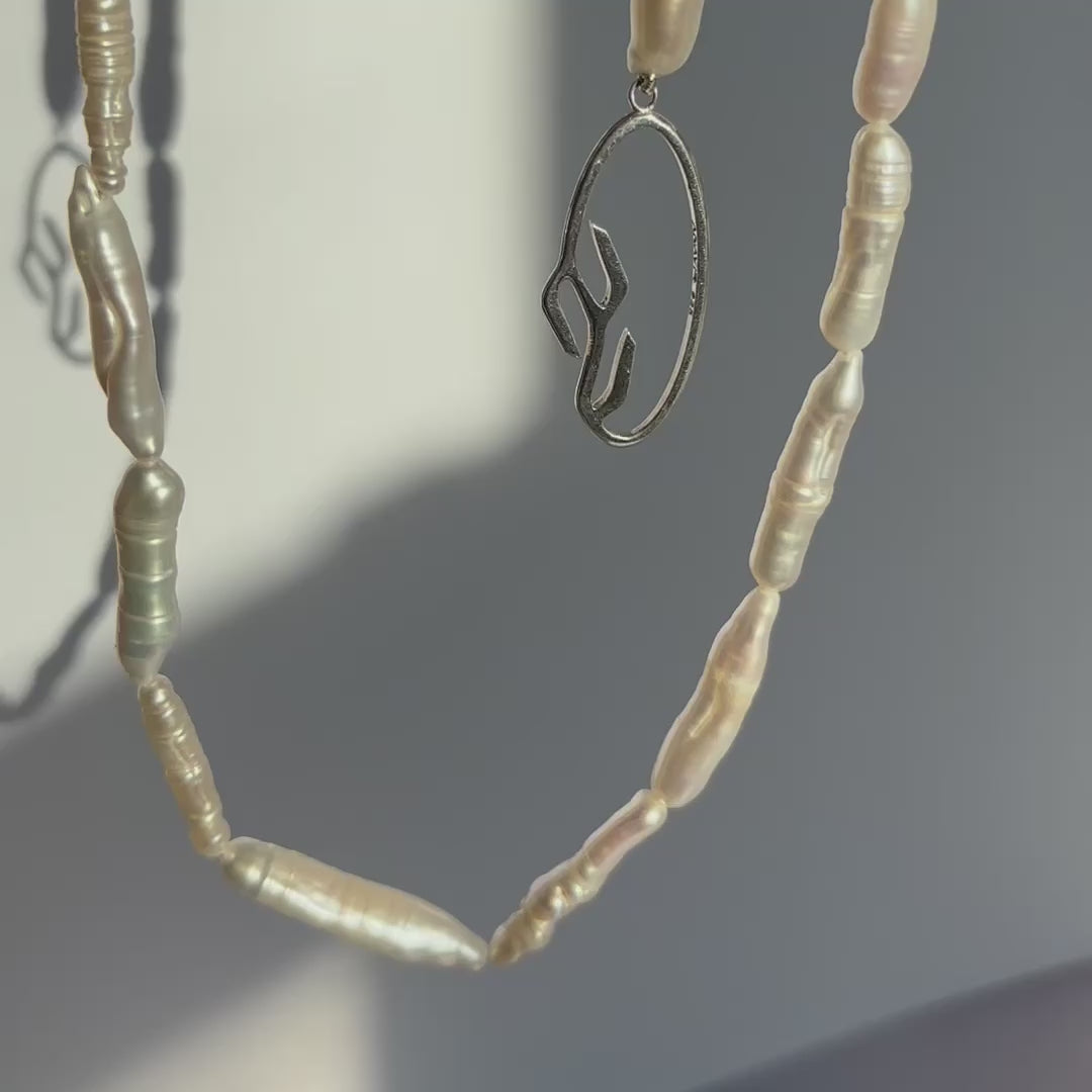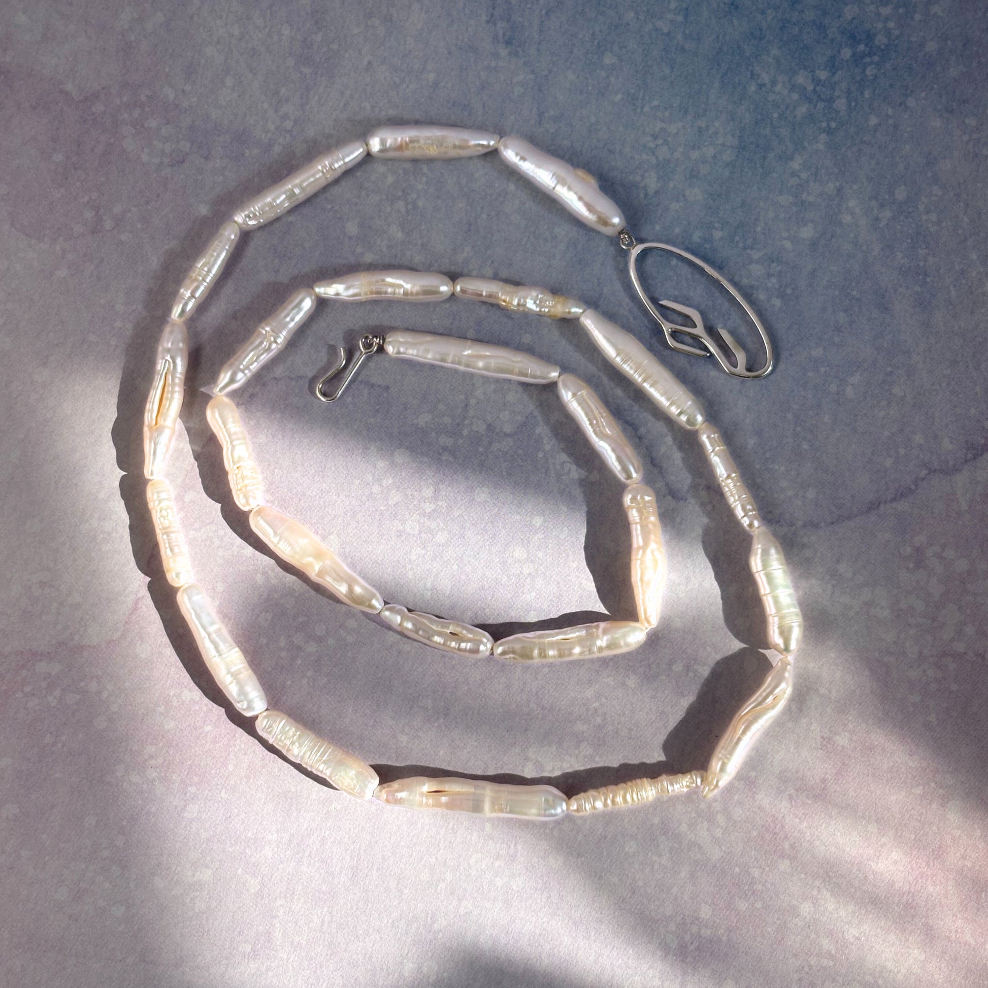 Linear Pearl Necklace with Oval Branch Clasp in Sterling Silver