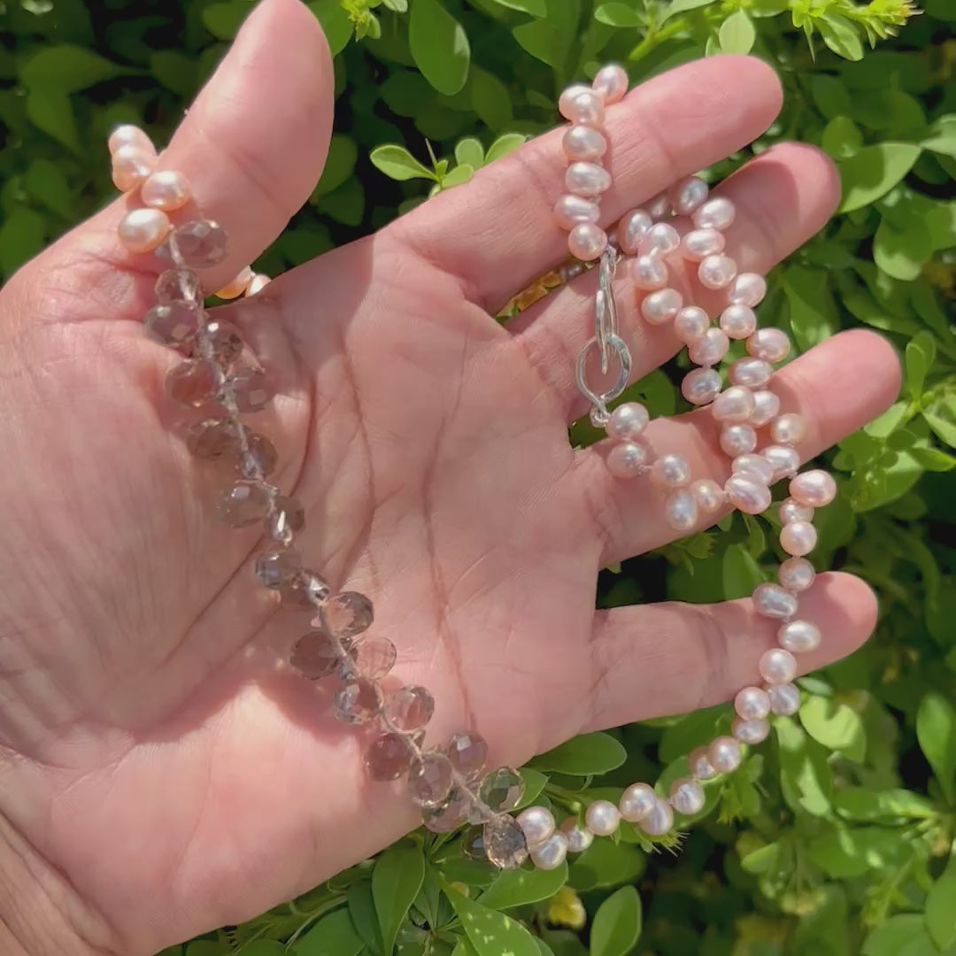 Elevate your elegance with the Rosy Veil Necklace, a harmonious blend of soft femininity and subtle mystery. This handcrafted piece features luminous pink freshwater pearls, each uniquely shaped to showcase their natural beauty, paired with faceted smoky quartz briolettes that shimmer with understated depth. The delicate interplay between the gentle blush pearls and smoky quartz evokes the ethereal softness of a rosy veil drifting over twilight waters.